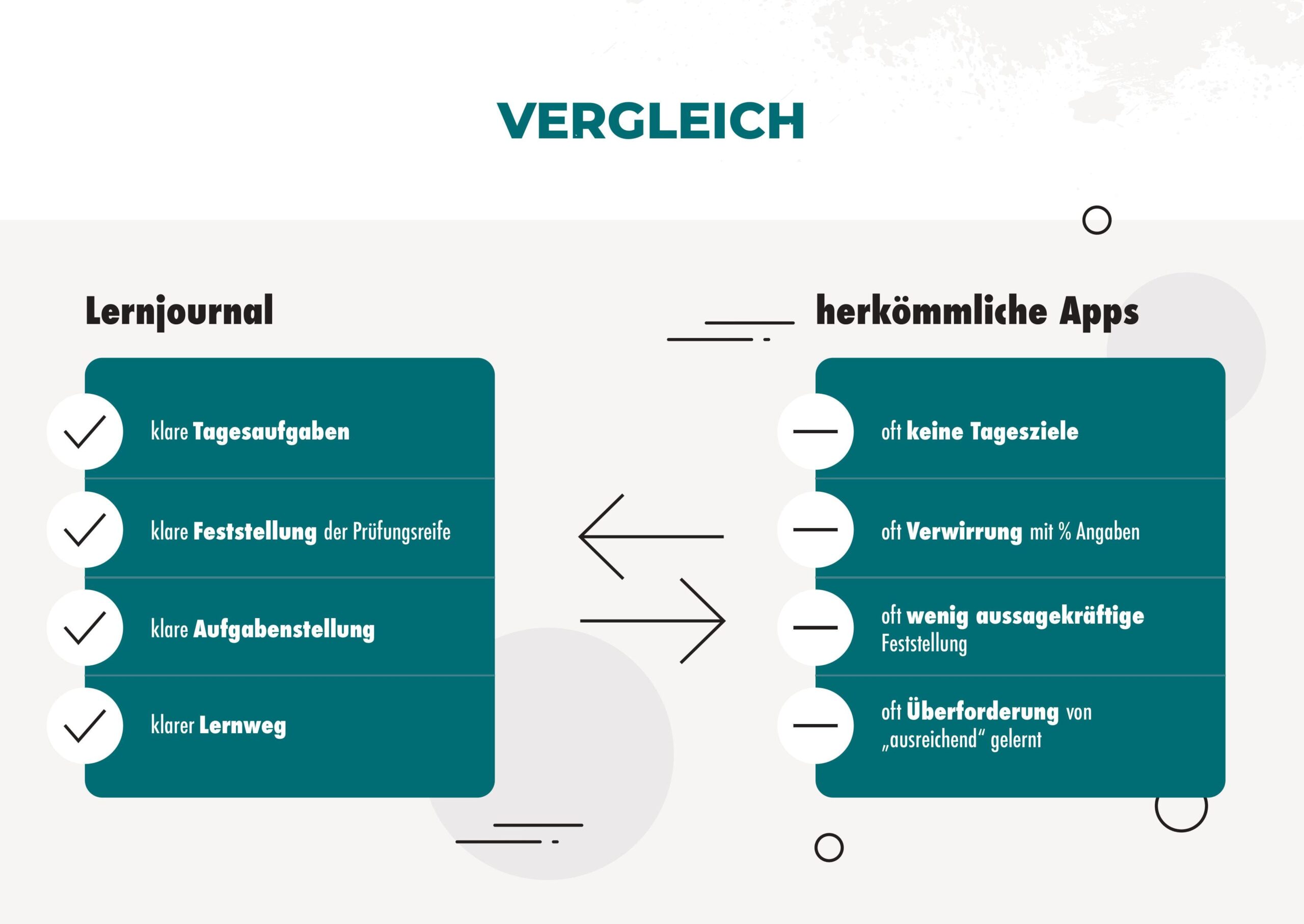 Wenn du dich konsequent an das Lernjournal hältst, besteht eine sehr hohe Wahrscheinlichkeit, dass du deine Prüfung bestehst. Sollte es dennoch nicht klappen, gibt dir das Journal hilfreiche Tipps, wie du dich optimal auf den nächsten Versuch vorbereiten kannst.